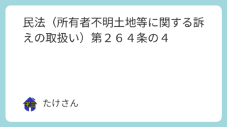 民法 民法(所有者不明土地等に関する訴えの取扱い)第264条の4 (所有者不明土地等に関する訴えの取扱い)第二百六十四条の四 所有者不明土地管理命令が発せられた場合には、所有者不明土地等に関する訴えについては、所有者不明土地管理人を原告又は被告とする。令和6年5月24日 施行 2025.09.11 民法