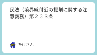 民法 民法(境界線付近の掘削に関する注意義務)第238条 (境界線付近の掘削に関する注意義務)第二百三十八条 境界線の付近において前条の工事をするときは、土砂の崩壊又は水若しくは汚液の漏出を防ぐため必要な注意をしなければならない。令和6年5月24日 施行 2025.09.11 民法