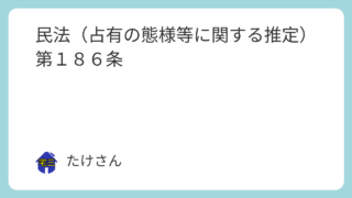 民法 民法(占有の態様等に関する推定)第186条 (占有の態様等に関する推定)第186条 占有者は、所有の意思をもって、善意で、平穏に、かつ、公然と占有をするものと推定する。2 前後の両時点において占有をした証拠があるときは、占有は、その間継続したものと推定する。令和6年5月24日 施行最... 2025.09.11 民法