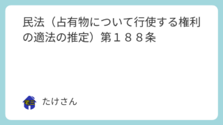民法 民法(占有物について行使する権利の適法の推定)第188条 第二節 占有権の効力(占有物について行使する権利の適法の推定)第百八十八条 占有者が占有物について行使する権利は、適法に有するものと推定する。令和6年5月24日 施行 2025.09.11 民法