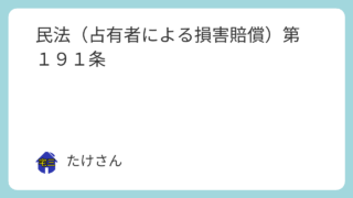 民法 民法(占有者による損害賠償)第191条 (占有者による損害賠償)第百九十一条 占有物が占有者の責めに帰すべき事由によって滅失し、又は損傷したときは、その回復者に対し、悪意の占有者はその損害の全部の賠償をする義務を負い、善意の占有者はその滅失又は損傷によって現に利益を受けている限度... 2025.09.11 民法