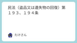 民法 民法(盗品又は遺失物の回復)第193、194条 (盗品又は遺失物の回復)第193条 前条《第192条(即時取得)》の場合において、占有物が盗品又は遺失物であるときは、被害者又は遺失者は、盗難又は遺失の時から2年間、占有者に対してその物の回復を請求することができる。第194条 占有者が、盗... 2025.09.11 民法