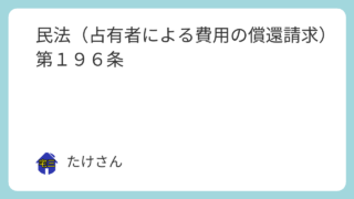 民法 民法(占有者による費用の償還請求)第196条 (占有者による費用の償還請求)第百九十六条 占有者が占有物を返還する場合には、その物の保存のために支出した金額その他の必要費を回復者から償還させることができる。ただし、占有者が果実を取得したときは、通常の必要費は、占有者の負担に帰する。2 ... 2025.09.11 民法
