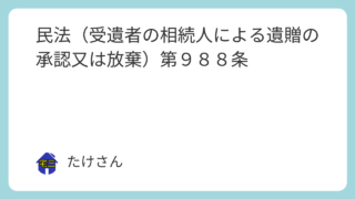 民法 民法(受遺者の相続人による遺贈の承認又は放棄)第988条 (受遺者の相続人による遺贈の承認又は放棄)第九百八十八条 受遺者が遺贈の承認又は放棄をしないで死亡したときは、その相続人は、自己の相続権の範囲内で、遺贈の承認又は放棄をすることができる。ただし、遺言者がその遺言に別段の意思を表示したときは、... 2025.09.25 民法