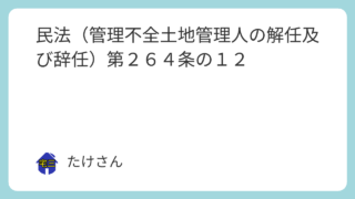 民法 民法(管理不全土地管理人の解任及び辞任)第264条の12 (管理不全土地管理人の解任及び辞任)第264条の12 管理不全土地管理人がその任務に違反して管理不全土地等に著しい損害を与えたことその他重要な事由があるときは、裁判所は、利害関係人の請求により、管理不全土地管理人を解任することができる。2 ... 2025.09.11 民法