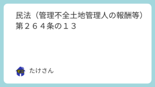民法 民法(管理不全土地管理人の報酬等)第264条の13 (管理不全土地管理人の報酬等)第264条の13 管理不全土地管理人は、管理不全土地等から裁判所が定める額の費用の前払及び報酬を受けることができる。2 管理不全土地管理人による管理不全土地等の管理に必要な費用及び報酬は、管理不全土地等の所有者... 2025.09.11 民法